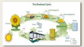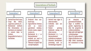This document discusses various types of bioenergy including biomass, biogas, and biofuels. It defines biomass as a renewable energy source derived from living or recently living organisms. Key types of biomass discussed include wood, agricultural waste, solid waste, and landfill gas. Methods of converting biomass to energy include burning, bacterial decay, fermentation, and thermal or chemical conversion. Biogas is produced via the bacterial breakdown of organic waste. Algae and crops can be converted to liquid biofuels like ethanol or biodiesel. While bioenergy has benefits like being renewable and reducing emissions, it also has disadvantages like being expensive to produce and store and requiring significant space.