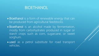 Bagasse, a waste product of sugarcane processing, can be used to produce bioethanol through fermentation. Bagasse contains cellulose that can be broken down through pretreatment and hydrolysis into glucose, then fermented by bacteria like Clostridium thermocellum into bioethanol. Producing bioethanol from bagasse provides an environmentally friendly alternative fuel and makes use of an agricultural waste product.