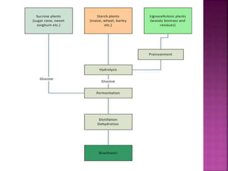 Bioethanol is produced through the fermentation of sugars from various agricultural sources like corn, sugarcane, and cellulosic materials. It has benefits as a renewable fuel that can reduce dependence on crude oil and emissions. There are three main steps in production: fermentation of sugars into ethanol, distillation to separate ethanol from water, and dehydration to purify the ethanol. Lignocellulosic materials like wood and crop residues can also be broken down enzymatically to produce fermentable sugars for ethanol production, but this process is more complex than using easily accessible starch sources. Bioethanol shows potential as a cleaner burning alternative fuel but still faces challenges in efficiency and infrastructure compatibility compared to gasoline.