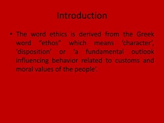 The document discusses bioethics and research ethics. It begins with definitions of ethics, biomedical research, and clinical research. It then outlines the history of international ethical guidelines, including the Nuremberg Code, Declaration of Helsinki, and others. The document defines types of research involving human participants and discusses the importance of research ethics in promoting values like honesty, accountability, and minimizing harm. It concludes by outlining several codes for research ethics regarding topics like informed consent, confidentiality, and protecting human subjects.
