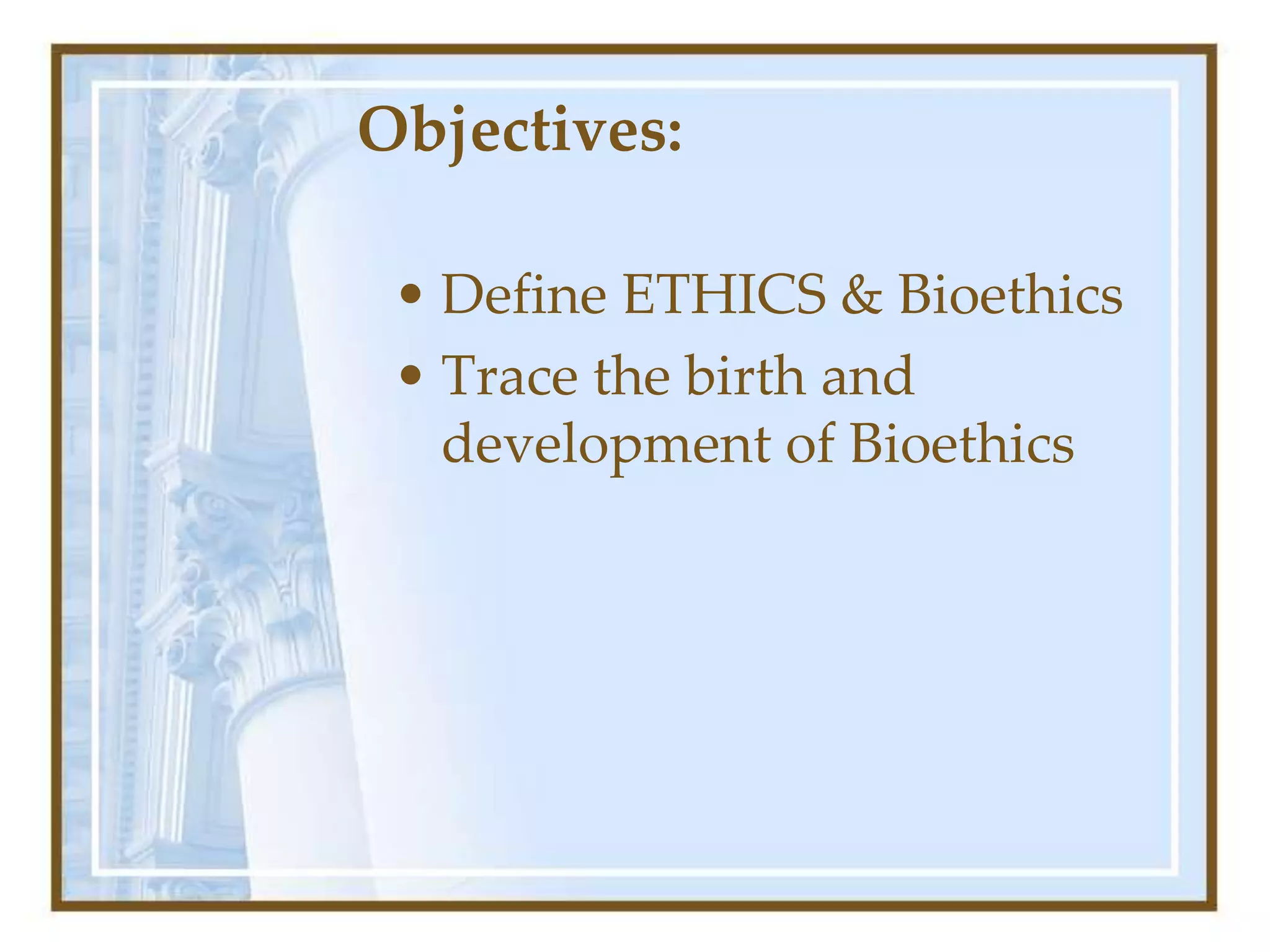 This document provides an introduction to bioethics. It defines ethics as the study of morality and human behavior, and bioethics as the application of ethical principles to life sciences and medicine. The document traces the birth and development of bioethics, including historical codes like the Hippocratic Oath, and key events that shaped research ethics and clinical ethics like the Nazi experiments, Tuskegee study, and Belmont Report. It discusses emerging issues in areas like artificial organs, new reproductive technologies, and end of life care. The document emphasizes that clarifying current problems in biomedicine requires understanding the nature and dignity of the human person.