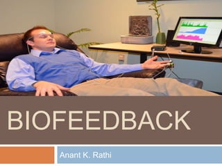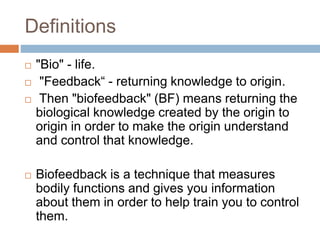 Biofeedback is a technique that measures bodily functions and provides feedback to help people learn to control them. It involves sensors attached to the body to detect physiological activity like muscle tension, heart rate, breathing, and skin temperature. Signals from the sensors provide visual or auditory feedback to help users recognize mind-body connections and learn to control targeted responses through relaxation or other techniques. Over time with training, people can self-regulate physiological responses without the external feedback equipment. Biofeedback has applications for treating conditions like chronic pain, hypertension, seizure disorders, incontinence, and more by enhancing awareness of stress responses and developing self-regulation skills.