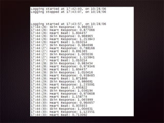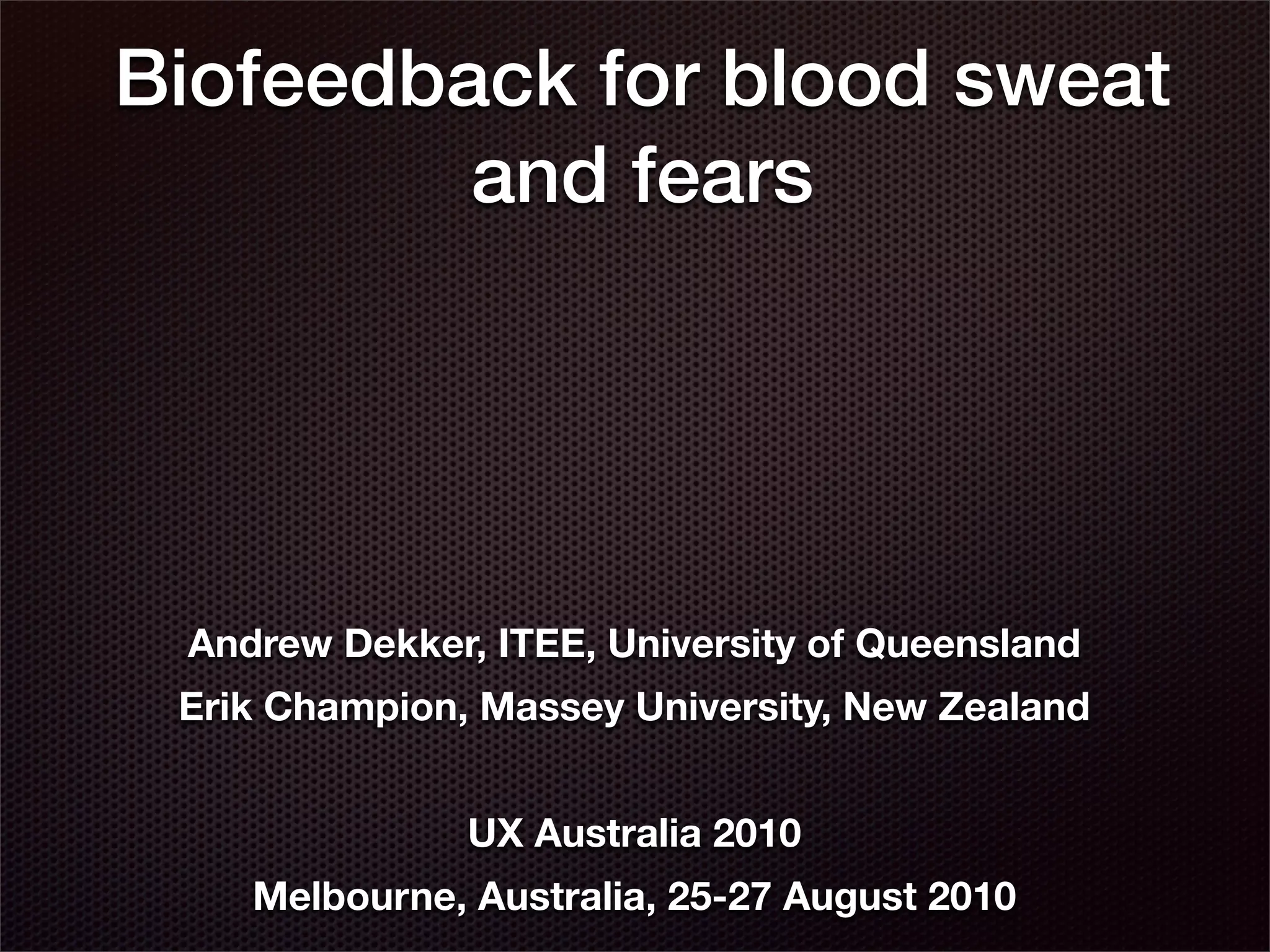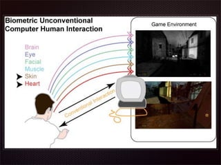 This document summarizes a presentation given by Andrew Dekker from the University of Queensland and Erik Champion from Massey University in New Zealand at UX Australia 2010 in Melbourne. The presentation discussed using biometric feedback devices to adapt computer games dynamically based on a user's physiological responses. It provided examples of games that have used biometric data like Emotiv and Neurosky devices. A study was described that used a biometric sensor with a first-person shooter game to detect users' galvanic skin response, heart rate and body temperature to trigger different game events based on their stress levels. The presentation concluded by discussing the potential for biometric feedback to create more engaging adaptive gaming experiences.