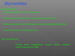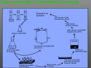 Biofertilizers are microbial preparations that enhance soil fertility by fixing nitrogen, solubilizing phosphorus, and promoting plant growth through their biological activities, serving as a sustainable alternative to chemical fertilizers. They can replace 25-30% of chemical fertilizers and improve soil health while also stimulating plant growth. The production and effectiveness of biofertilizers depend on factors such as microbial strain selection, quality control, and methods of application, with liquid formulations offering advantages over traditional carrier-based systems.