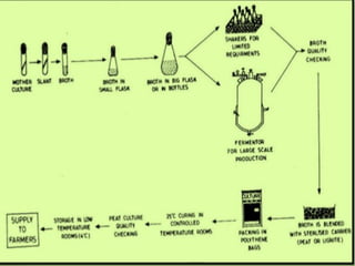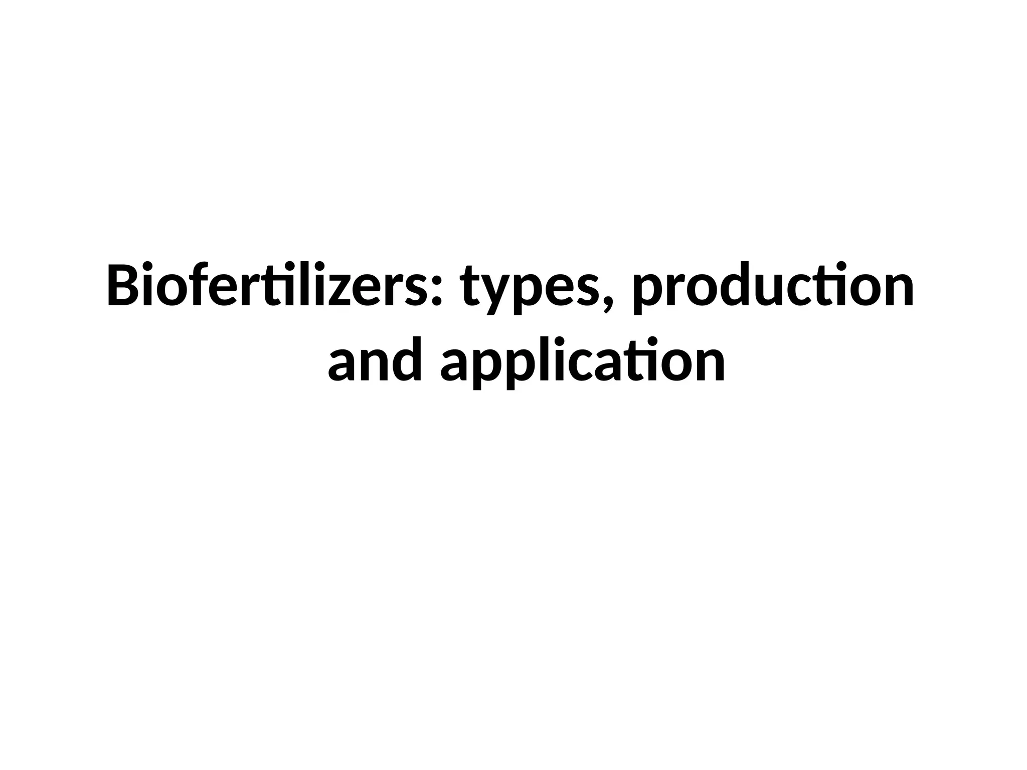 Les biofertilisants sont des substances contenant des micro-organismes vivants qui favorisent la croissance des plantes en augmentant la disponibilité des nutriments. Ils se classifient en plusieurs types, notamment les fixateurs d'azote, les solubilisateurs de phosphore et de potassium, et les bactéries promouvant la croissance des plantes. La production de biofertilisants nécessite une sélection des souches efficaces, leur culture dans des milieux appropriés et des procédures de conditionnement pour garantir la viabilité des cellules.