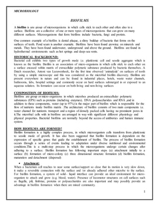 - Biofilm formation is a complex, multi-step process involving initial attachment, microcolony formation within an extracellular matrix, maturation, and eventual dispersal or detachment of cells. Dispersal allows biofilms to spread and colonize new surfaces.