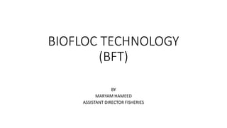 Biofloc technology (BFT) is a technique used in aquaculture to balance carbon and nitrogen in a system using microbial aggregates called biofloc. The biofloc provides protein, lipids, amino acids, and fatty acids to fish. BFT aims to produce more aquaculture with minimum land and water usage through sustainable, environmentally-friendly systems. It involves limiting water exchange so organic residues accumulate and bacteria thrive, controlling water quality. Fish consume the bacteria while feed is recycled. The process requires high stocking density, aeration, lined ponds, and suitable feeding to develop biofloc over 7-15 days until it reaches the desired density above 10ml/l, at which point fish are introduced