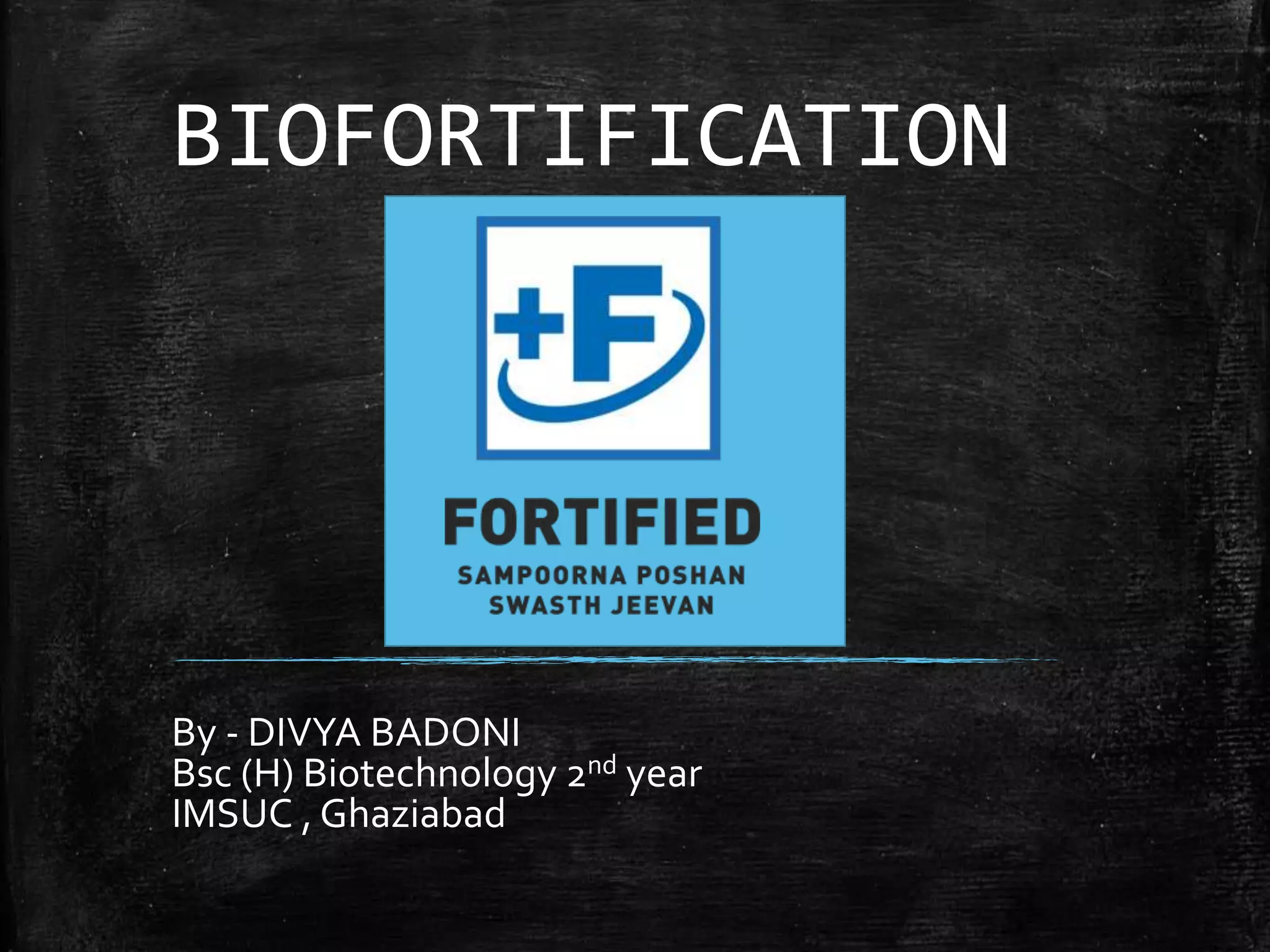 Biofortification is the process of enhancing the nutritional quality of food crops through various agricultural methods and biotechnology to combat hidden hunger. It includes examples of crops enriched with essential vitamins and minerals, developed by institutions like IARI and ICAR, with notable varieties such as vitamin A enriched carrot and calcium enriched spinach. The practice is cost-effective and has shown significant economic returns, making it a potential solution for improving nutrition in developing countries.