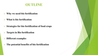 This presentation discusses biofortification as a strategy to address malnutrition. Biofortification involves breeding staple food crops to increase their micronutrient levels, targeting iron, zinc, and vitamin A. The goal is to reduce micronutrient deficiencies in low-income populations by improving the micronutrient density of staple crops they produce and consume. Selective breeding and fertilizer application can increase crop micronutrient levels. Organizations like HarvestPlus are developing biofortified varieties of crops like cassava, maize, and rice to combat malnutrition in subsistence farming communities. The benefits of biofortification include potentially reaching rural populations with limited access to supplements through a low-cost, sustainable intervention.