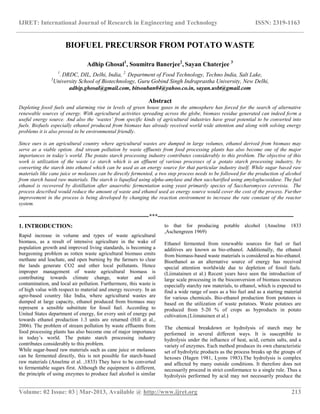 The document discusses the potential of converting potato waste into biofuel, specifically ethanol, as a renewable energy source to combat fossil fuel depletion and environmental issues. It outlines the process of converting starch to ethanol through liquefaction, saccharification, and fermentation using specific enzymes and yeast, highlighting the need for improved efficiency in ethanol production. The study emphasizes the economic viability of utilizing agricultural waste, particularly potatoes, in producing bioethanol and mitigating waste management problems in the food processing industry.