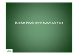 The document discusses Brazil's use of renewable fuels like biodiesel. It notes that over 45% of Brazil's energy comes from renewable sources, compared to around 12.9% globally. The Brazilian biodiesel program was introduced in 2005 and aims to diversify energy sources and reduce oil imports while promoting social development. Biodiesel production has increased from around 400,000 cubic meters in 2005 to a forecasted 2.5 million cubic meters in 2010. The industry faces issues around feedstock selection and costs that will need to be addressed for long term success.
