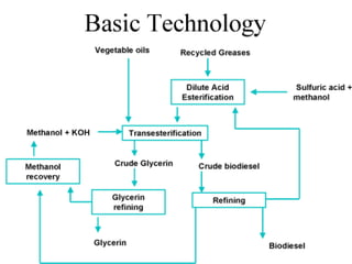Biofuel is a liquid fuel produced from plant or animal material and used as an alternative to petroleum-based fuels. There are several types of biofuels including biodiesel, bioalcohols like ethanol, and biogas. Biofuels can be produced from feedstocks like palm, coconut, jatropha seeds, rapeseed, and algae. They are produced through fermentation of sugar crops or by heating plant oils. Biofuels are a renewable source and their production can benefit rural development.