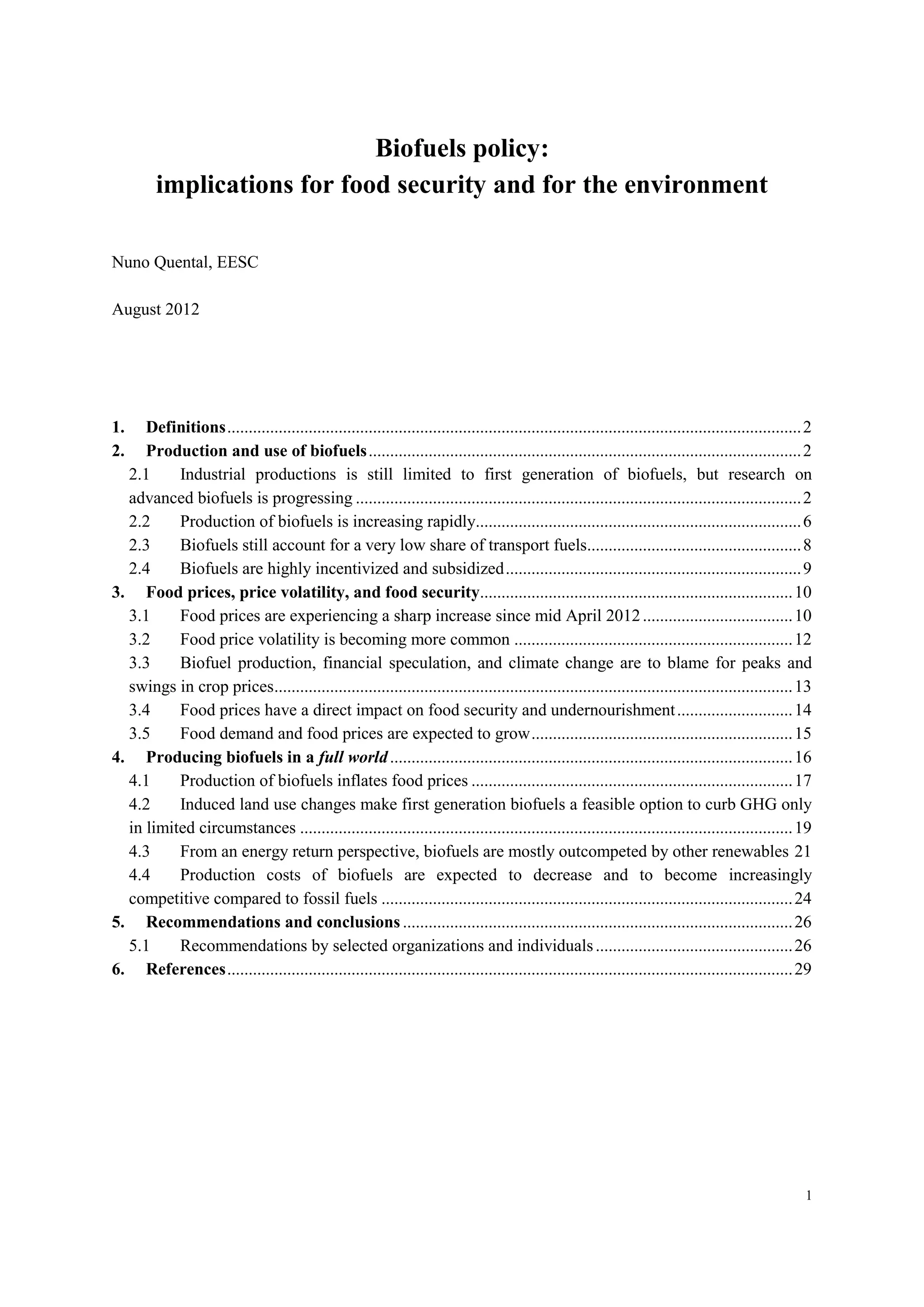 This document discusses biofuels policy and its implications for food security and the environment. It finds that while biofuels production is increasing rapidly, it is still limited mostly to first generation biofuels from food crops. This contributes to increasing and volatile food prices, threatening global food security. Advanced biofuels from non-food sources are being researched but have not been widely commercialized. The document recommends policies that incentivize biofuels in a way that does not compromise food security or the environment.