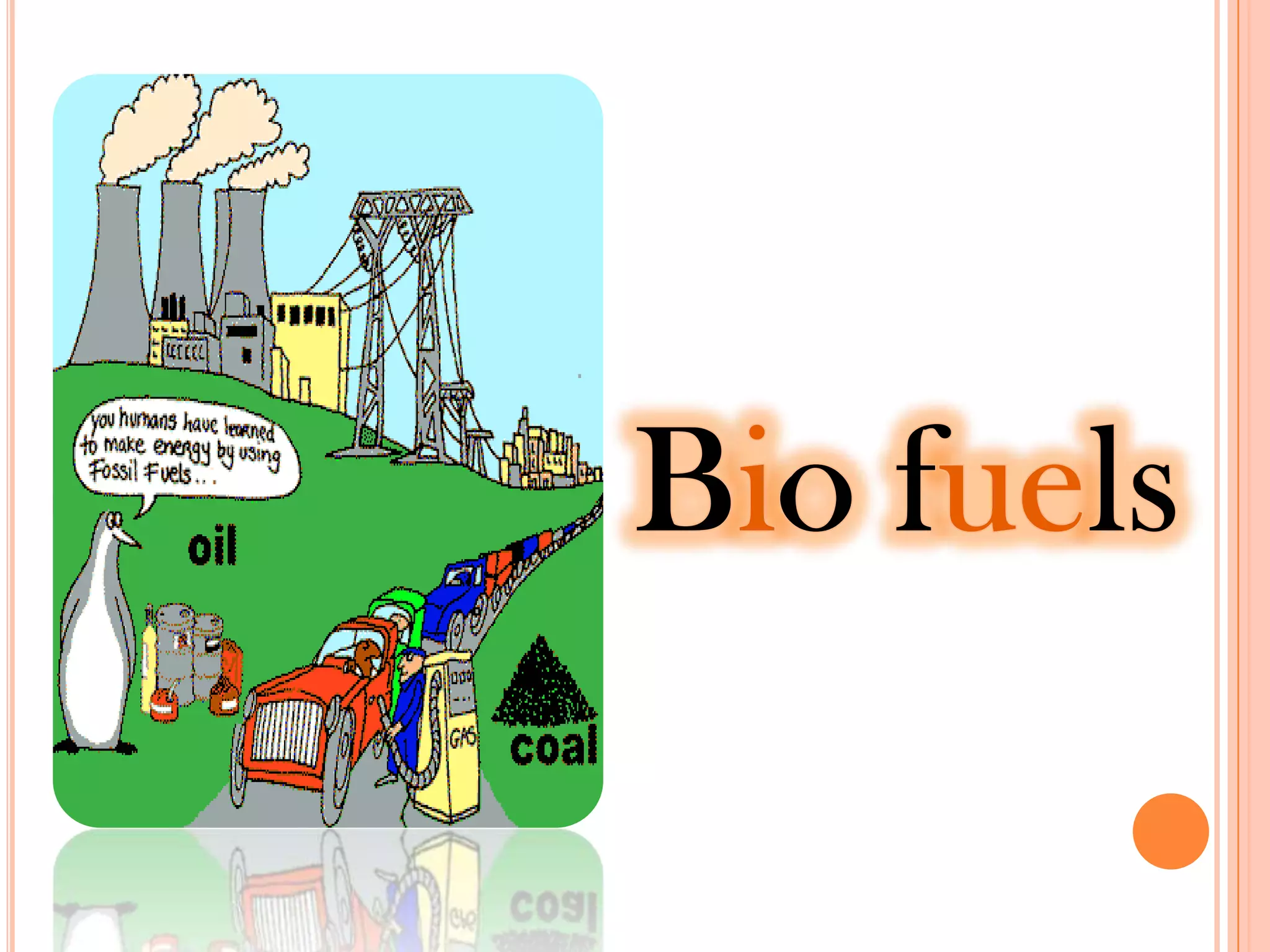 Biofuels are fuels produced from biological material and waste rather than fossil fuels. They contain over 80% renewable materials and are derived from photosynthesis, making them a solar energy source. While biofuels can be less expensive than gasoline and emit fewer emissions, their production can also increase food prices and produce unpleasant smells. New technologies could allow biofuels to displace 50% of global fuel supply without affecting food or pasture. However, many biofuel technologies require more development work to become viable alternatives to fossil fuels by 2050.