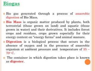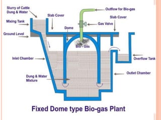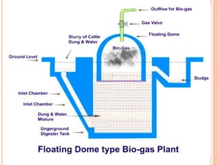 The document discusses biogas plants and provides details about different types of biogas plants including fixed dome plants, floating gas holder plants, KVIC plants, Pragathi plants, and Janata plants. It describes the construction, working, raw materials used, and advantages and disadvantages of each type of plant. Key points covered include how biogas is produced via anaerobic digestion of biomass, the components of biogas, and uses of biogas as a fuel.