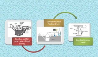 Dokumen ini membahas tentang biogas, termasuk mekanisme reaksinya, keuntungan penggunaan biogas sebagai energi alternatif, dan aplikasi anaerobik yang dapat mengurangi limbah. Proses ini melibatkan beberapa tahap, seperti hidrolisis, asidifikasi, dan metanogenesis, serta mencantumkan alat dan bahan yang diperlukan untuk pembuatan sistem biogas. Selain itu, dijelaskan bahwa biogas dapat menggantikan bahan bakar fosil dan mengurangi emisi gas rumah kaca.