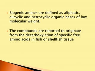 Biogenic amines, such as histamine, cadaverine, and putrescine, are significant for determining fish safety and quality, with histamine being especially critical due to its association with scombroid poisoning. Symptoms of poisoning can occur quickly, and prevention strategies include rapid chilling of fish and good hygiene practices. Aflatoxins, produced by certain fungi, pose serious health risks and can be controlled through proper storage and testing methods.