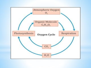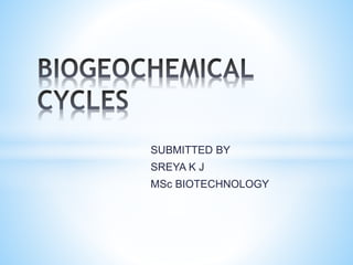 The document summarizes several important biogeochemical cycles, including the carbon, nitrogen, phosphorus, sulfur, and oxygen cycles. It describes how each element is cycled between the biosphere, geosphere, and atmosphere through biological and chemical processes. Microorganisms play a key role in transferring nutrients between different forms and facilitating exchange through oxidation-reduction reactions. All of the cycles are interlinked as they involve the movement of elements between living organisms and their environment.