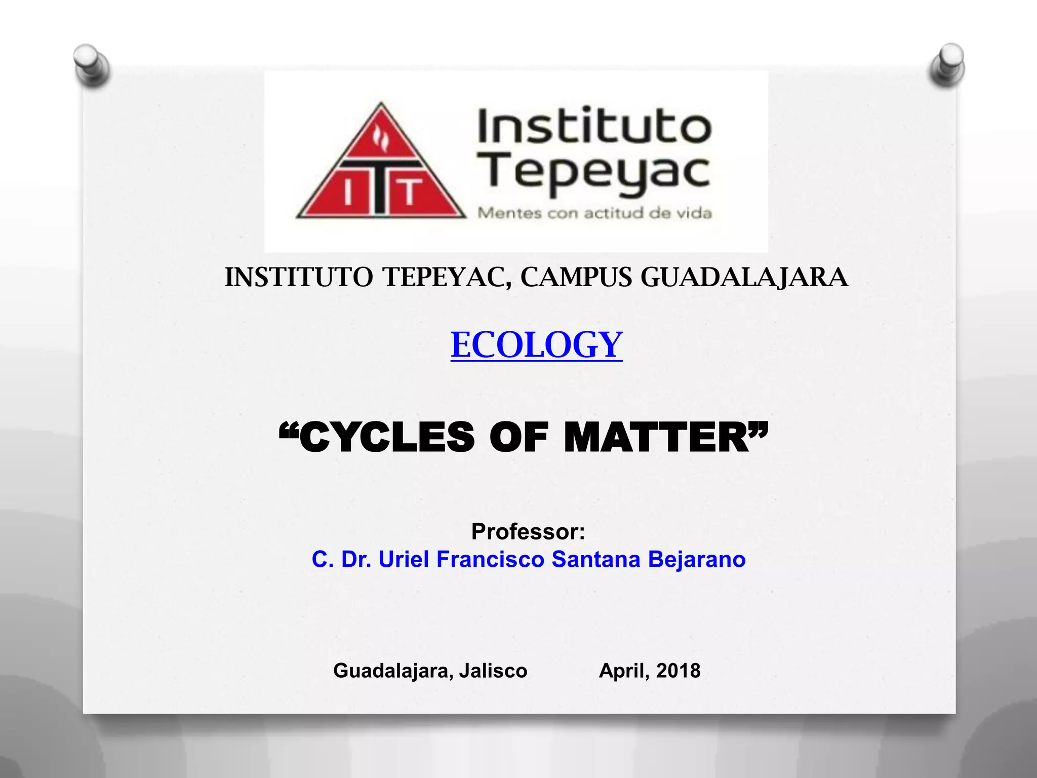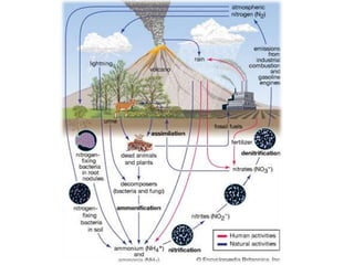This document outlines activities for students to learn about several biogeochemical cycles. It includes questions for students to answer about the water, carbon dioxide, nitrogen, phosphorus, sulfur, and mercury cycles. For each cycle, it asks about the overall process, which Earth systems are involved, important steps, and ecological issues. The goal is for students to understand how these essential elements are circulated and transformed through biotic and abiotic processes in the biosphere, hydrosphere, lithosphere and atmosphere. Any disruptions to these natural cycles could significantly impact Earth's climate and living organisms. The professor provides their contact information and thanks the reader for their attention.