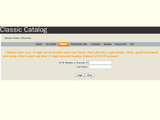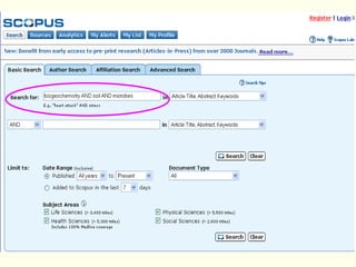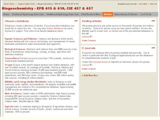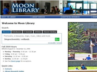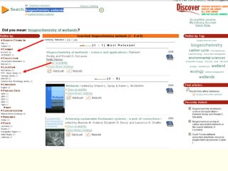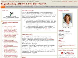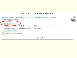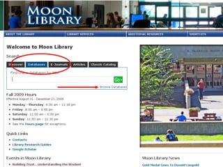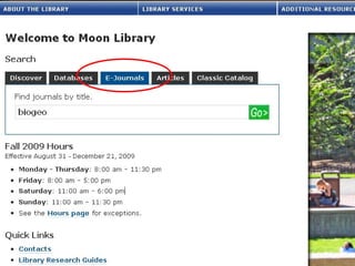 Linda Galloway provides information about library resources for biogeochemistry studies at Moon Library. She lists the research assistance hours, library hours, and how to find books and articles through databases on the library website. Specific databases relevant to biogeochemistry field are suggested on the Biogeochemistry Libguide.
