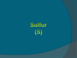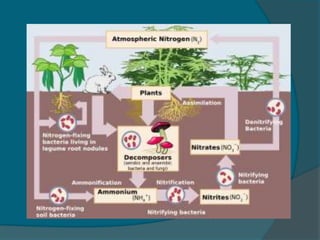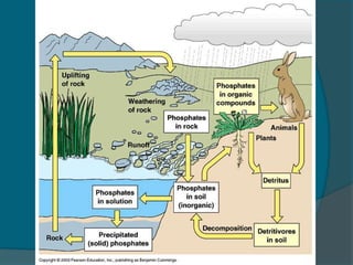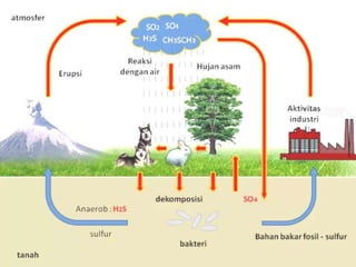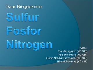 Dokumen ini membahas tentang daur biogeokimia sulfur, fosfor, dan nitrogen, serta pentingnya masing-masing unsur bagi kelangsungan hidup makhluk hidup. Sulfur dan fosfor terlibat dalam siklus yang melibatkan gejala iklim dan reaksi biologis, sedangkan nitrogen penting dalam pembentukan protein dan asam nukleat. Proses-proses seperti fiksasi, asimilasi, amonifikasi, nitrifikasi, dan denitrifikasi merupakan bagian dari siklus nitrogen yang mempengaruhi ekosistem.