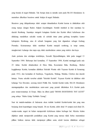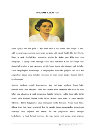 Raden Ajeng Kartini lahir pada 1879 di Jepara dan tumbuh dalam keluarga bangsawan yang taat pada adat. Meskipun ingin belajar lebih lanjut, ia dilarang oleh orangtuanya dan dipaksa menikah. Kartini kemudian berjuang untuk pendidikan dan emansipasi wanita melalui pembentukan sekolah dan surat-menyurat dengan teman-temannya. Ide-idenya telah memotivasi perjuangan kaum wanita Indonesia.