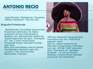 ANTONIO RECIO Jordi Sánchez, Bartzelonan, Espainian, 1964ko maiatzaren 13an jaiozan. BiografiaProfezionalaBartzelonakoUnivertsitatAutonomoan, Erizaintzandiplomatua da. Bainaerizaintzautzi eta interpretazioradedikatuzan. BartzelonakoInstitut del Teatrenlizentziatu eta gero, “Krampack S.L” eta “L’avemproduccions” konpainiaklangunbatzuekinfundatuegineban. Bere obra teatraletakobatzukhainbatherrialdeetanestreinatuegindira: Londres, Txile, Buenos Aires, Montevideo, Caracas…2001ean ZilarrezkoFotogrametaranominatua izan zan, PlatsBrutspelikulari esker.2001an, aktorehoberenalezZilarrezkoFotogramaranominatua izan zan. 2003an MAX saria jaso eban “Krampack-en” egindakolanagatik. La que se avecina telesaian, Antonio Recio deitutakopertsonaiabatinterpretatu.