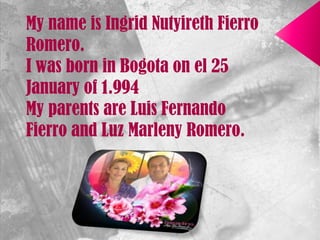 Ingrid Nutyireth Fierro Romero was born in Bogota, Colombia on January 25, 1994 to parents Luis Fernando Fierro and Luz Marleny Romero. Her dreams are to study social communication, see the world, and have a successful future that allows her to support her family. In her free time, she enjoys going shopping, to the gym, and spending time with friends on weekends.