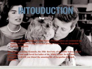 Jacqueline Kennedy Onassis was the 35th First Lady of the United States as the wife of President John F. Kennedy. She grew up wealthy in New York and was well-educated. She married JFK in 1953 and they had four children together. As First Lady from 1961-1963, she was young, beautiful, and stylish, throwing great parties at the White House. In 1963, JFK was assassinated in Dallas, leaving Jackie a widow at age 34. She later married Greek shipping magnate Aristotle Onassis in 1968 but the marriage was unhappy. Jackie Kennedy Onassis died of cancer in 1994.