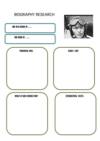 The document discusses researching a biography but provides no details about the person's life. It lists common biography section headings like early life, interesting facts, and what they were famous for, but the sections are empty. No information is given about the person's date of birth, place of birth, date of death, accomplishments, or why they are notable.