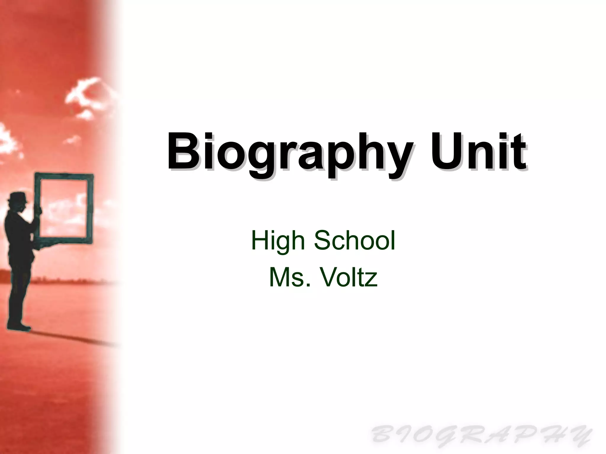 This document outlines the requirements and expectations for a biography research report and oral presentation assignment in a high school biography unit. Students will research a person of their choosing, write a 4-6 page essay about that person, and present their findings to the class. The essay must integrate research from multiple credible sources while avoiding plagiarism. Students will learn skills like developing a thesis, organizing research, citing sources, and revising their work. The unit is designed to help students meet various California state standards related to research, writing, and oral presentation skills.