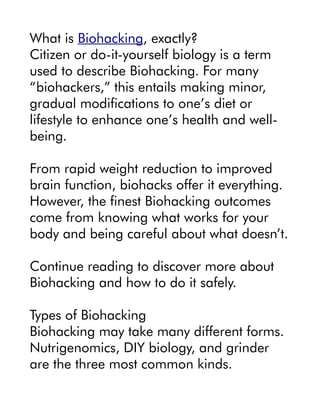Biohacking involves making gradual changes to diet and lifestyle for health improvement, with common types being nutrigenomics, DIY biology, and grinder techniques. While biohacking can yield benefits, safety concerns arise, especially with extreme practices like body modification or unregulated supplements. Caution is advised as individual responses to biohacking can vary, making professional guidance important before significant changes.