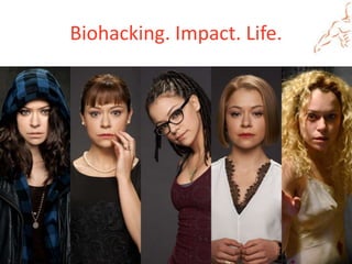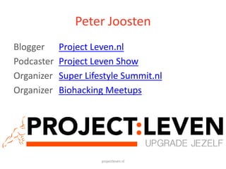 The document discusses biohacking and its impact on life, highlighting trends such as genetics, lifestyle influence, and societal effects. It outlines strategies for biohacking simplicity through comfort and hormesis, providing tips on sleep, sunlight exposure, cold exposure, and intermittent fasting. The writer, Peter Joosten, is involved in various biohacking projects, including events and podcasts.