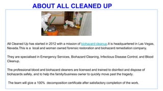 All Cleaned Up is a certified biohazard cleanup company based in Las Vegas, Nevada, established in 2012. They specialize in biohazard remediation, including crime scene cleanup, infectious disease control, and hoarding situations, while ensuring certified decontamination and a satisfaction guarantee. Their services cover various biohazard situations and include thorough cleaning processes for both residential and commercial properties across the state.