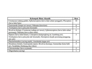 Dokumen tersebut membahas mengenai berbagai bioindikator dan indeks untuk menilai kualitas perairan, seperti Nilai Nutrisi Coeffecient (NVC), komunitas makroinvertebrata, Indeks Pencemaran Biologik (IPB), Indeks Saprobik, Indeks Coliform, serta alat pengambilan sample seperti Surber Net dan Plankton net. Bioindikator digunakan untuk mengetahui kondisi lingkungan berdasarkan keberadaan atau perilaku organ