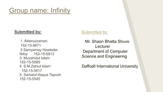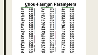 This document contains a presentation submitted by 5 students to their lecturer at Daffodil International University. It summarizes the Chou-Fasman method for secondary structure prediction of proteins. The method uses a statistical approach to assign probabilities for alpha helix, beta sheet, and coil conformations based on amino acid preferences. It then applies rules to scan the protein sequence and identify regions that meet the criteria for each secondary structure type. The accuracy of secondary structure prediction using this method is around 50-60%.