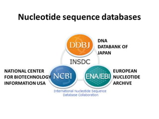 1) The document discusses various bioinformatics databases including nucleotide databases like GenBank that contain nucleic acid sequences, protein databases like PDB that contain 3D protein structures, and specialized databases like dbSNP that contain human single nucleotide variations.