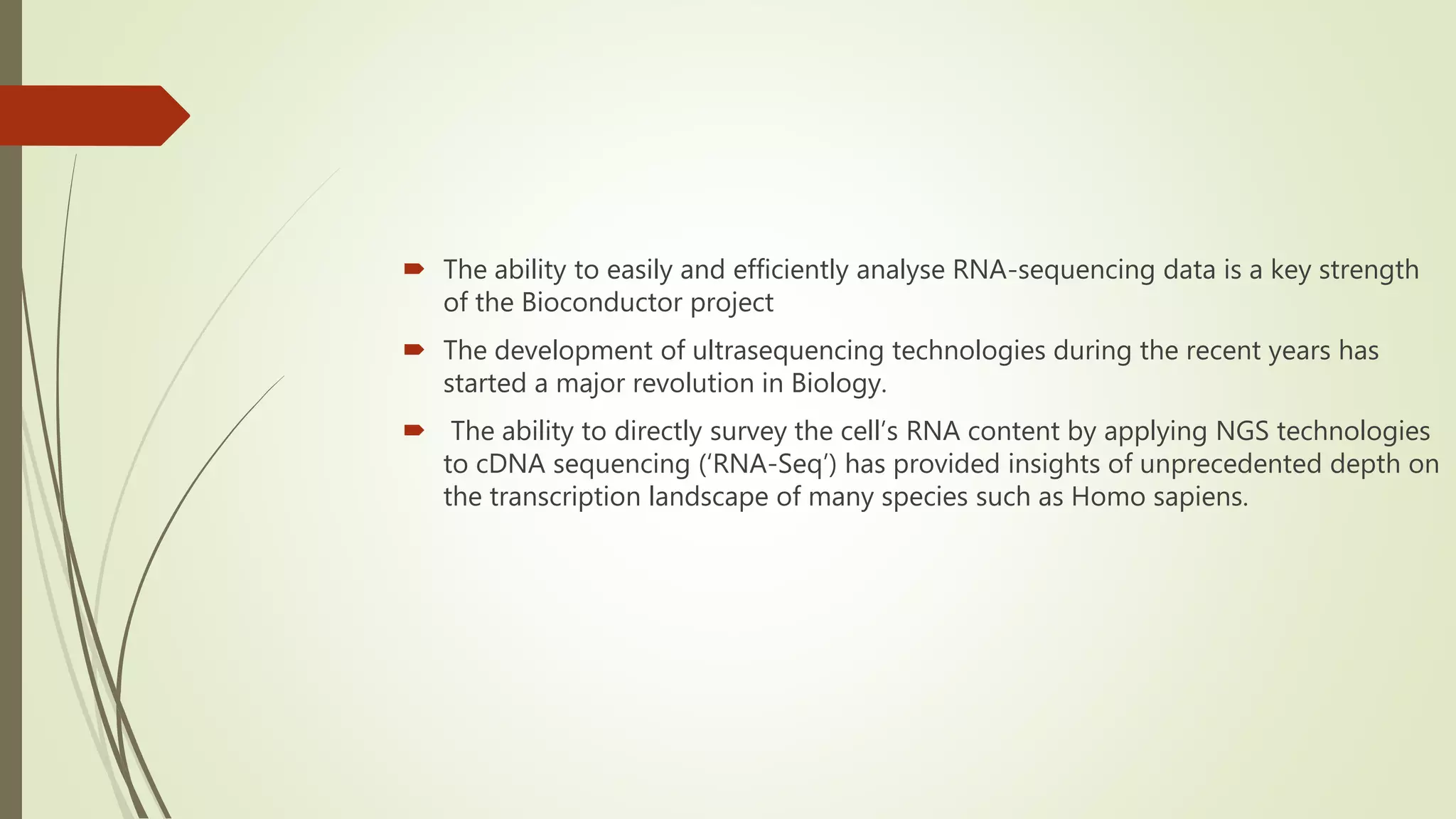 The document discusses the significance of RNA sequencing (RNA-seq) in bioinformatics and the need for efficient analysis tools, highlighting the Grape analysis pipeline's capabilities for managing and visualizing RNA-seq data. It outlines the key steps of Grape's workflow, including preprocessing, mapping, post-mapping, transcript quantification, and discovering novel transcribed elements. Additionally, it addresses RNA-seq analysis using the Bioconductor packages limma, glimma, and edgeR for differential expression analysis and gene set testing.