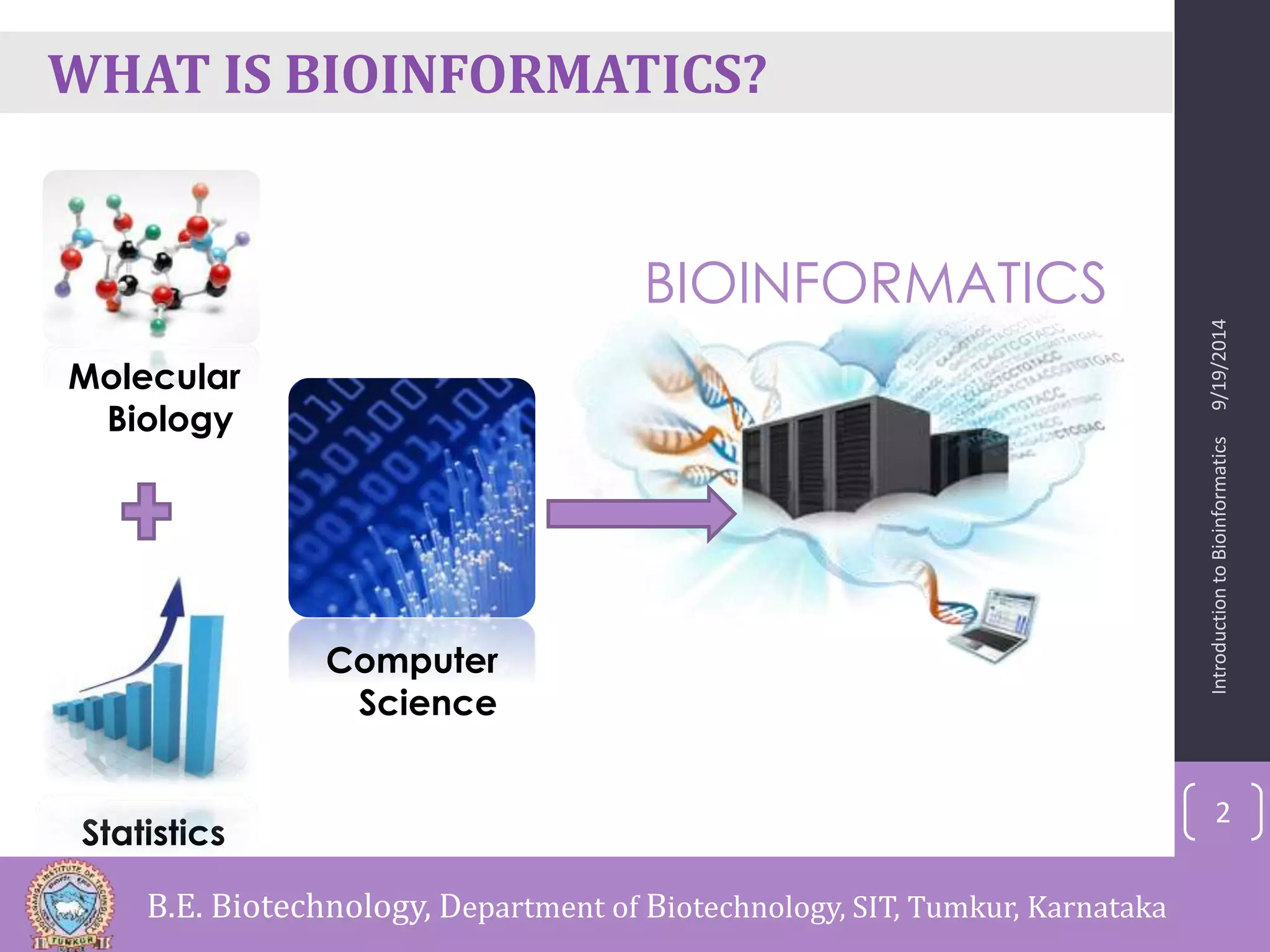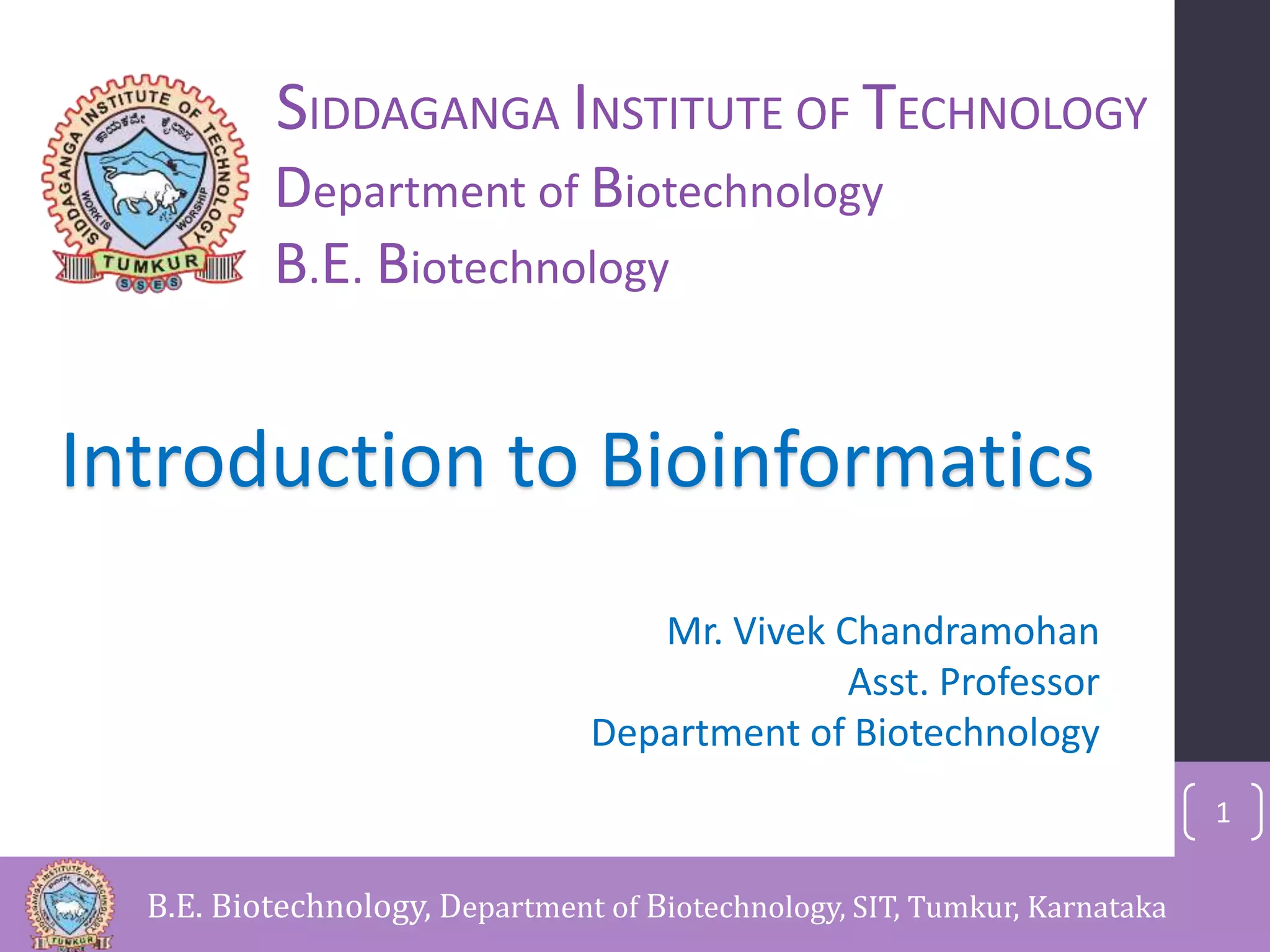 Bioinformatics is defined as the field that studies biology using computers and information technology. It involves the collection, storage, and analysis of molecular biological data. Some key events in bioinformatics history include Watson and Crick proposing the DNA double helix structure in 1953 and the development of databases like GenBank and algorithms like BLAST and FASTA in the 1980s to aid in database searching. The goals of bioinformatics are to better understand living cells at the molecular level by analyzing raw molecular data. It has become important due to the explosive growth of biological data and need for large databases and tools to access and study this information.