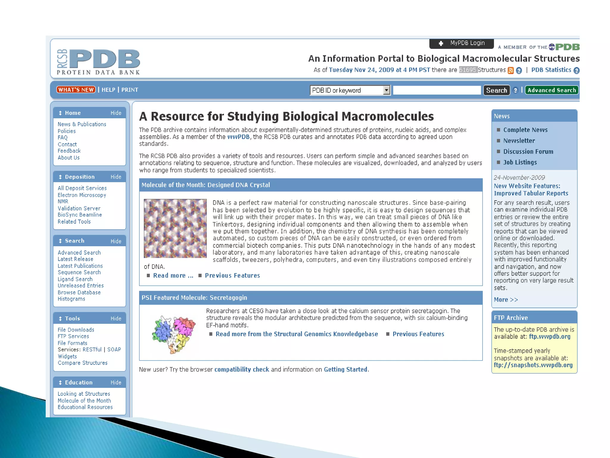 The Protein Data Bank (PDB) is a worldwide archive of 3D structural data of biological macromolecules including proteins and nucleic acids. It was established in 1971 and currently holds over 40,000 structures. The PDB is jointly managed by four organizations as part of the Worldwide Protein Data Bank to ensure open access to structural data. Structures are primarily determined via X-ray crystallography and NMR spectroscopy and deposited by researchers globally.