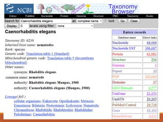 This document provides an introduction and overview of bioinformatics resources. It begins by outlining the objectives of understanding different bioinformatics databases and tools, learning how to search and navigate the National Center for Biotechnology Information (NCBI) database, and finding additional help. Definitions of bioinformatics are provided. The document then describes various applications of bioinformatics and directs the reader to a subject guide on bioinformatics resources. It proceeds to categorize major types of freely available bioinformatics resources as databases versus tools, and as curated versus uncurated databases. Specific examples like GenBank, BLAST, and RefSeq are outlined. The document concludes by providing contact information for questions.