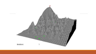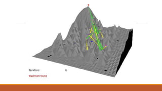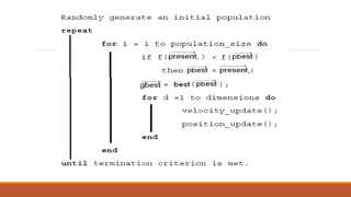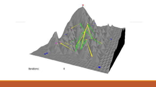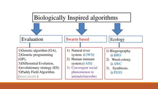 Swarm intelligence is a biologically inspired field that studies how social behaviors emerge from the interactions between individuals in a decentralized system. It draws inspiration from natural systems like bird flocking and ant colonies. Particle swarm optimization and ant colony optimization are two popular swarm intelligence algorithms. PSO mimics bird flocking by having particles update their velocities based on their own experience and the swarm's experience. ACO mimics ant foraging behavior by having artificial ants deposit and follow pheromone trails to iteratively find optimal solutions. Both algorithms have been applied to problems like optimization and routing.