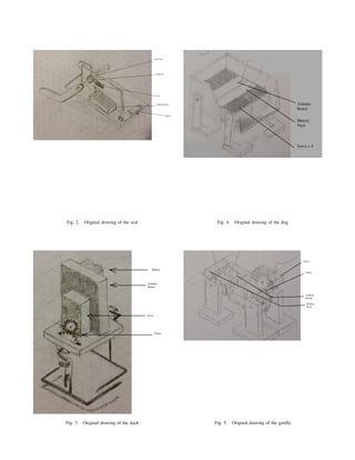 This document summarizes the design process of a bio-inspired walking robot. It began with four conceptual designs, two using one servo and two using multiple servos. After analysis, a design mimicking a seal gait was selected as the simplest. Statics and kinematics analysis determined a 2:1 gear ratio was needed to provide sufficient torque. The robot was built, but initially the servo could not handle the weight. Weight was reduced and arm lengths adjusted, allowing it to successfully walk 4.9 meters as required. The analysis upfront helped produce a simple, robust design that performed well.