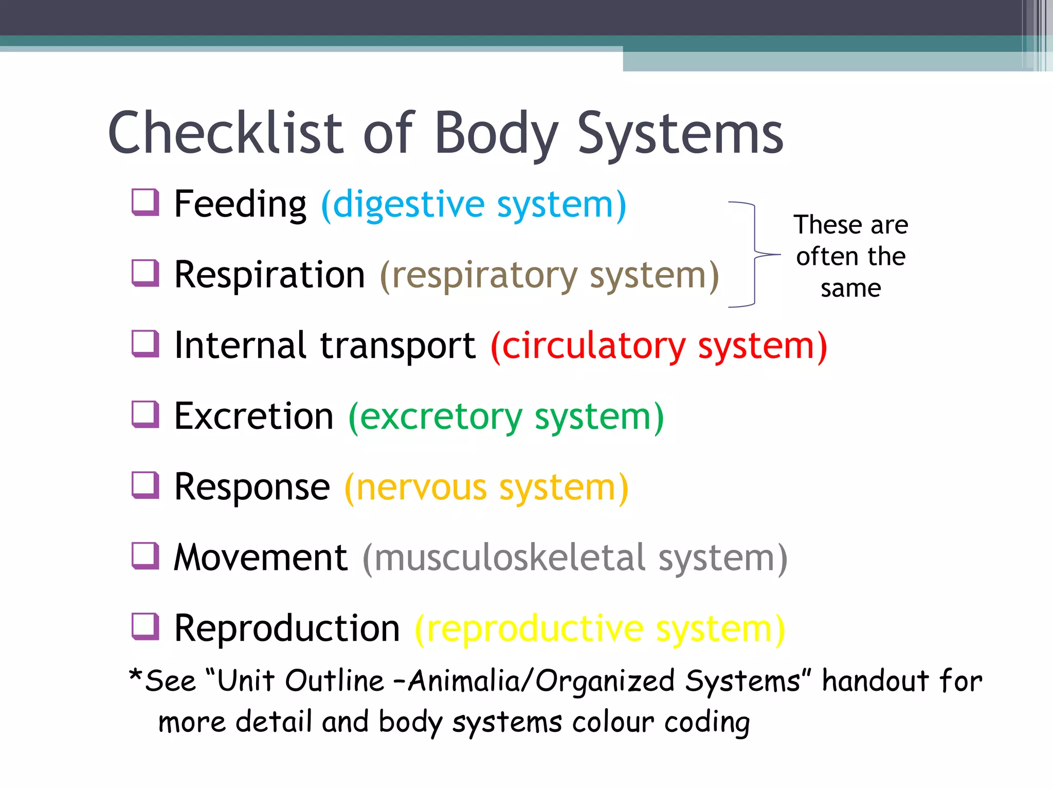 The document provides an overview of the key body systems in animals: digestive system, respiratory system, circulatory system, excretory system, nervous system, musculoskeletal system, and reproductive system. It describes the basic functions of each system, such as the digestive system being responsible for feeding, the respiratory system for respiration, and so on. Examples are given for different types of feeding, respiration, circulation, movement, and reproduction among animals.