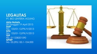 Dokumen ini menjelaskan legalitas PT. Bio Lentera Agung dan visi-misi perusahaan dalam menciptakan peluang wirausaha melalui sistem jaringan pemasaran. Mereka menawarkan berbagai produk dan bonus kepada anggota, serta menjelaskan konsep gotong royong dalam menginvestasikan dan memasarkan produk. Perusahaan mengklaim bahwa setiap anggota dapat meraih keuntungan melalui sistem yang terstruktur dan ketentuan tertentu.