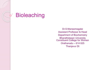 Bioleaching, also known as biomining or microbial leaching, is the process of extracting metals like copper, gold, and uranium from ores using microorganisms. Important microorganisms used in bioleaching include Thiobacillus ferrooxidans and Thiobacillus thiooxidans. Bioleaching involves either direct contact between bacteria and mineral surfaces, or indirect leaching where bacteria generate chemical oxidants. Major industrial processes for bioleaching include heap, dump, and in situ leaching. Bioleaching provides an environmentally friendly alternative for extracting metals from low-grade ores.