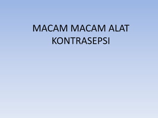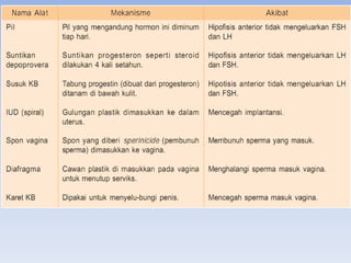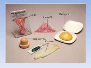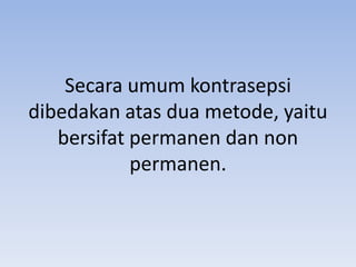 Dokumen tersebut membahas berbagai metode kontrasepsi, baik yang bersifat permanen maupun non-permanen. Metode permanen untuk wanita adalah tubektomi sedangkan untuk pria adalah vasektomi. Metode non-permanen meliputi kondom, pil KB, suntik KB, susuk KB, IUD, spons vagina, dan diafragma. Setiap metode memiliki mekanisme dan efektivitas berbeda-beda.