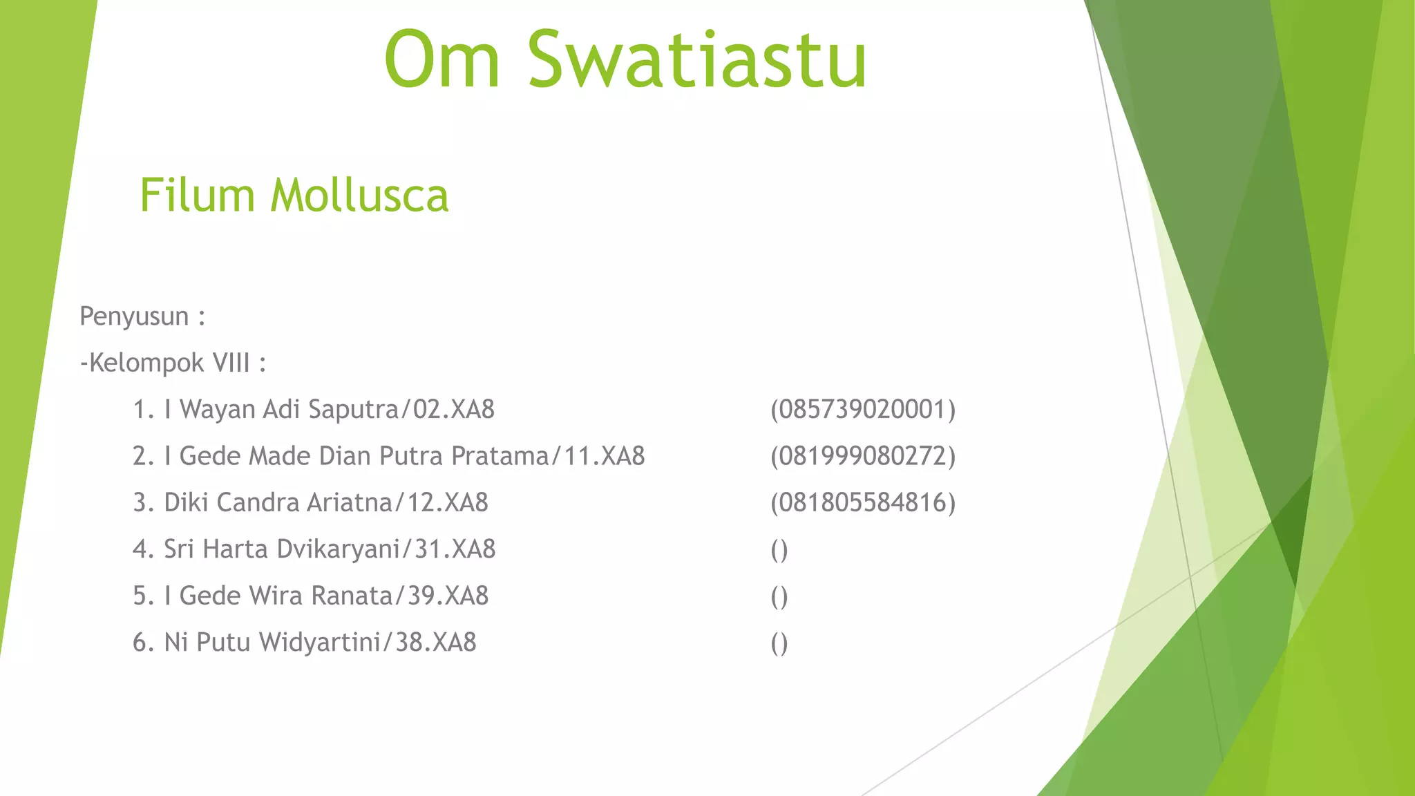 Dokumen ini menjelaskan tentang filum Mollusca, mencakup ciri-ciri umum, cara hidup, habitat, dan klasifikasi lebih lanjut dari berbagai kelas seperti Gastropoda, Polyplacophora, Scaphopoda, Cephalopoda, dan Bivalvia. Mollusca adalah hewan invertebrata dengan tubuh lunak, simetri bilateral, dan dapat hidup di air maupun darat. Reproduksi Mollusca umumnya dilakukan secara seksual dengan variasi dalam struktur tubuh dan kebiasaan hidup di setiap kelas.