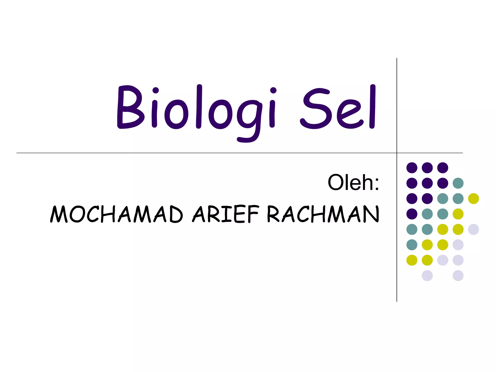 Dokumen ini membahas biologi sel, termasuk sejarah, struktur, dan fungsi sel. Teori sel dijelaskan dengan penekanan pada peran sel sebagai unit struktural dan fungsional dalam makhluk hidup, serta berbeda antara prokariotik dan eukariotik. Proses reproduksi sel seperti mitosis dan meiosis juga dijelaskan, termasuk perbedaan antara keduanya.