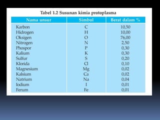 Dokumen tersebut memberikan ringkasan tentang biologi sel, mulai dari pengertian sel, sejarah penemuan sel, struktur sel, dan proses-proses yang terjadi di dalam sel seperti pembelahan sel, transpor zat, dan perbedaan antara sel hewan dan tumbuhan.